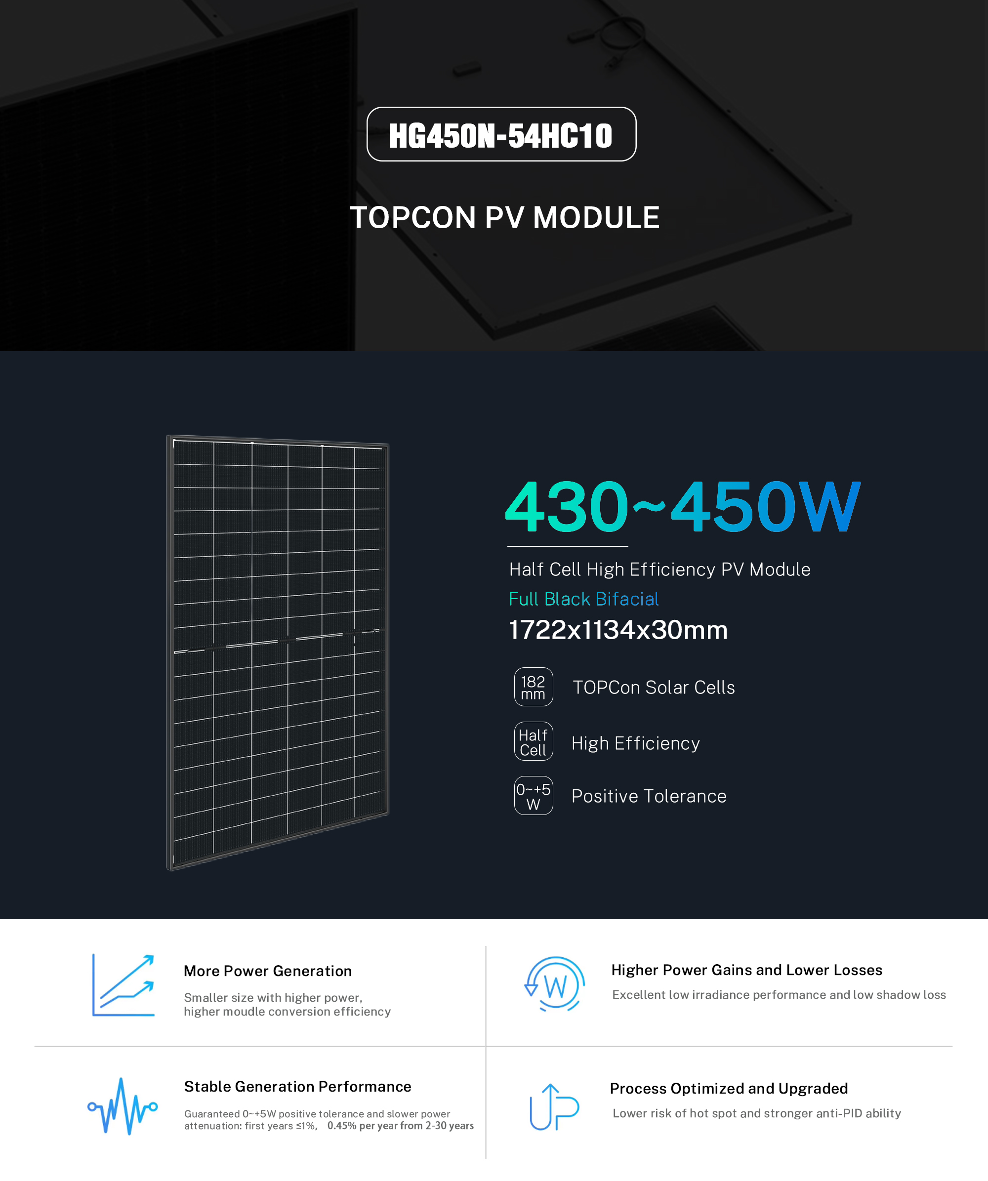 Bifaziale Module kombinieren die führende TOPCon-Technologie, MBB und Halbzellentechnologie. Das Higon N-Typ Bifaziale Halbzellen-Schwarzmodul erreicht eine Ausgangsleistung von bis zu 450 W.